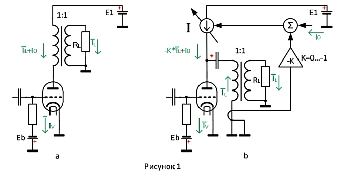 Допустим, на вход каскада поступает положительная полуволна сигнала. В классическом каскаде это приведет к отпиранию лампы и нарастанию ее тока, так как через лампу будет протекать сумма тока нагрузки и тока покоя – IL+I0=IV.