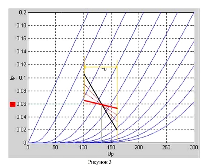 Из рисунка хорошо видно, что введение динамической стабилизации тока приводит к развороту и уменьшению длины нагрузочной прямой при одинаковом размахе переменного напряжения на аноде.
