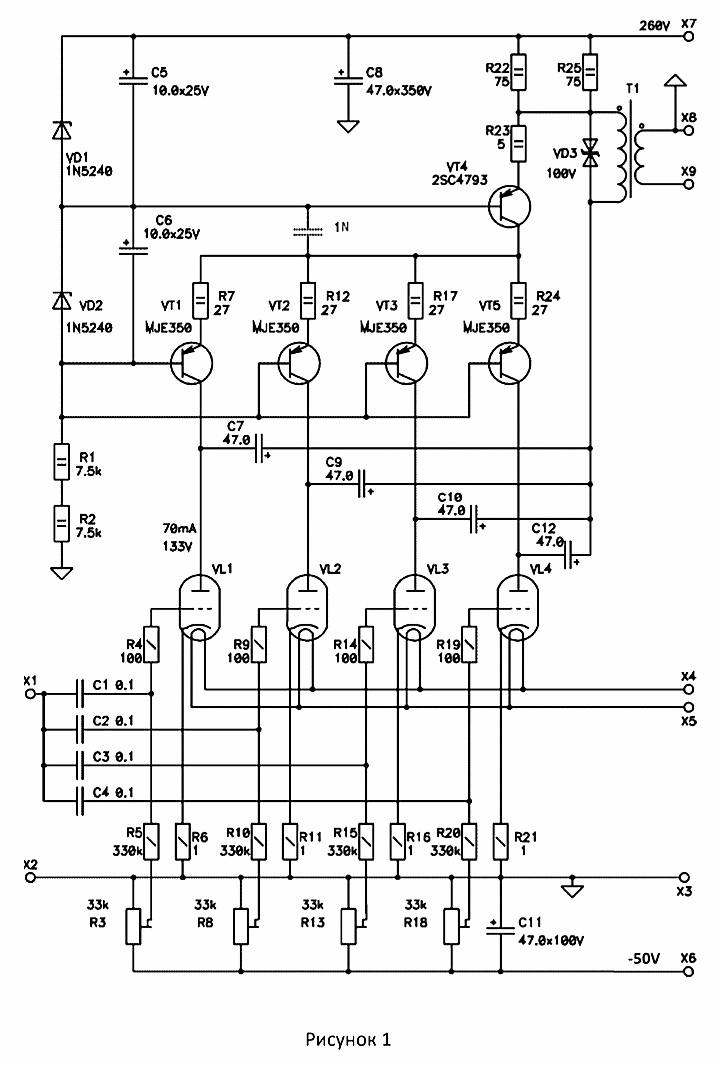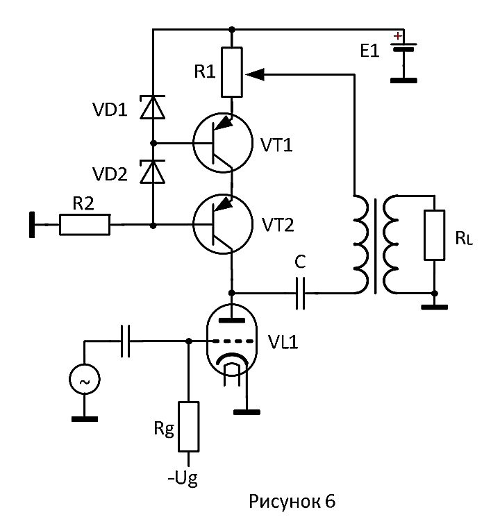 В анодную цепь мощного триода (6С19П) включен каскодный источник тока на транзисторах VT1, VT2.