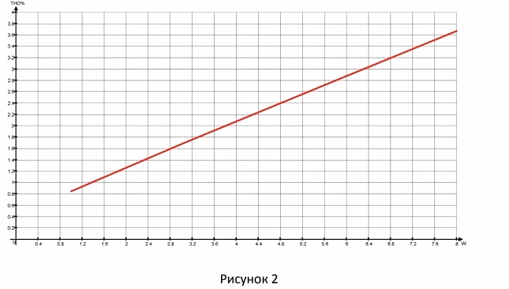 Большой ток покоя позволяет усилителю хорошо справляться со сложными нагрузками. Субъективно это выражается в лучшей проработке деталей и ровном тональном балансе. Ниже приведены зависимости общего коэффициента гармоник и