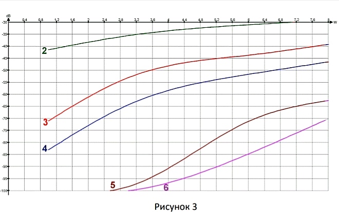 Уменьшение выходной мощности приводит к быстрому спаду уровней гармонических составляющих, высшие гармонические составляющие спадают быстрее.