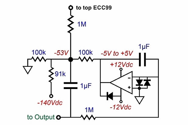Чтобы убрать постоянку на выходе, можно «прикрутить» эту схему на опере. Подключив её в верхнем плече выходного каскада, и на выход усилителя.
