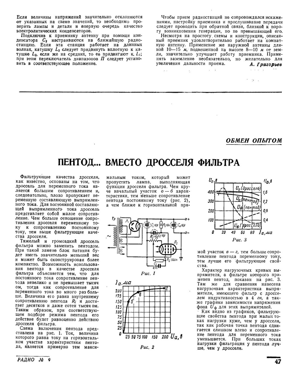 Схема включения пентода представлена на рис. 1. Ток, величина которого равна току на горизонтальном участке характеристики пентода, является примерно тем максимальным током, который может пропустить лампа, выполняющая функции дросселя фильтра. Чем круче начальный участок характеристики, тем меньше сопротивление пентода постоянному току (рис. 2), а чем ближе к горизонтальной прямой участок в — г, тем больше сопротивление пентода переменному току, тем лучше его фильтрующие свойства.