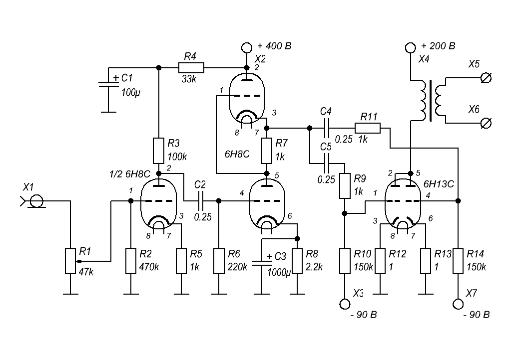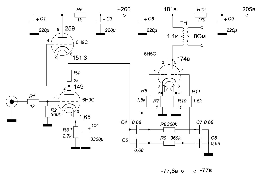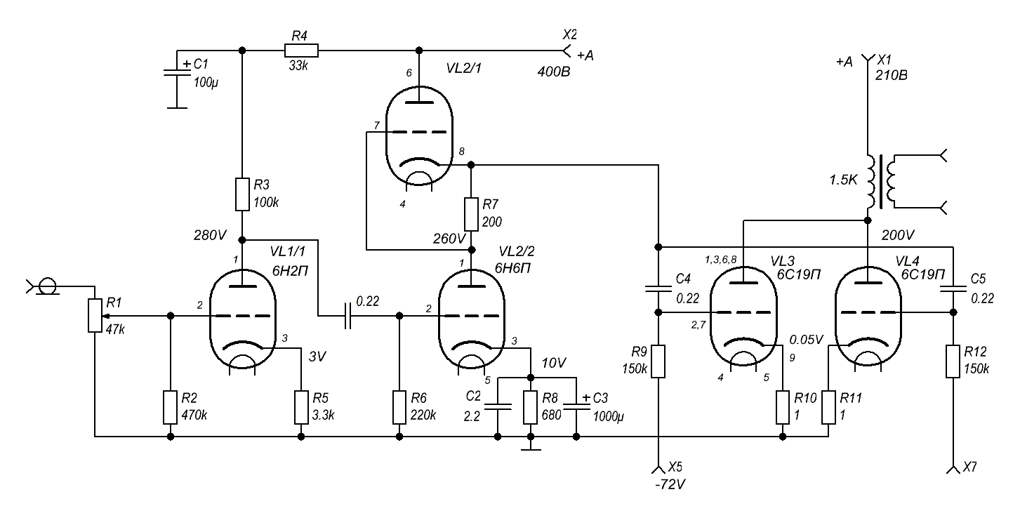 Усилитель SE на 8 ватт, на стабилизаторных лампах, типа 6Н5С, 6Н13С, 6С19П, 6С41С.