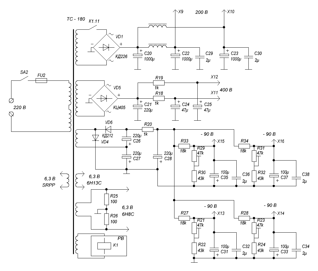Вернемся к 6Н13С. Макетируем – снимаем параметры – ожидаемой мощности нет! 🙂 В расстройстве загоняю лампы в предельные режимы. Главное запитал SRPP 400 В. Бояться пробоя катод накал не стоит, накал гальванически развязан с землей, стоит полет нормальный. Зато 6Н13 раскачалась до упора. Кто не хочет рисковать есть вариант, лишний триод с входного каскада. Но без 400В вы мощность не получите. Замеряем 8 Вт номинал. 🙂 Поигрался с катодными резисторами в SRPP. Интересный факт, который пока научно объяснить не могу, только догадываюсь – небольшая разбалансировка каскада привела к снижению нелинейных искажений на номинальной мощности менее 0,1% и это SE без обратных связей! Сразу оговорюсь такую настройку можно сделать только при соответствующей измерительной аппаратуре (я использовал С6-7). У кого такой возможности нет лучше не заморачиваться, можно сделать только хуже на звуке это практически не заметно. В заключении отмечу, чувствительность каскада слабоватая около 1 В. Меня это не устраивало, пришлось, сохраняя триодную концепцию подбросить один триод.